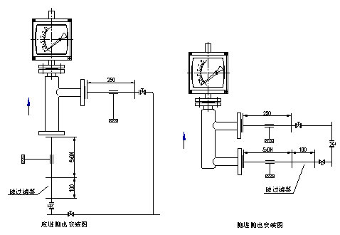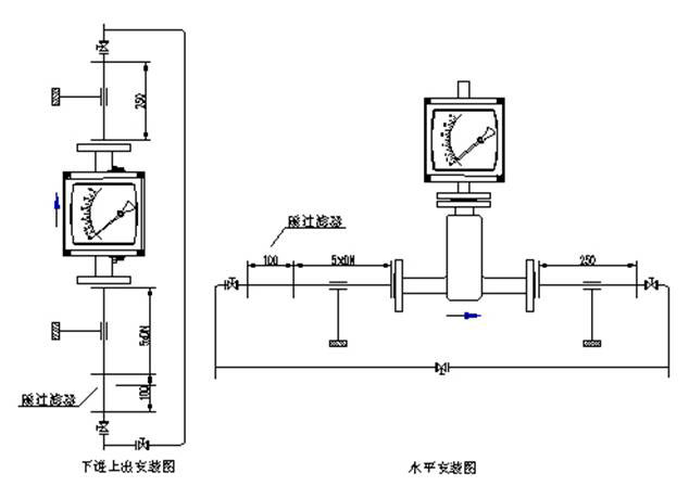流量計(jì)垂直安裝,流量計(jì)中心線與鉛垂線的夾角不超過(guò)5°,在流量計(jì)的上游須保證五倍公稱通徑的入口直管段,下游保證250mm出口直管段。如果介質(zhì)中含有固體雜質(zhì),應(yīng)在流量計(jì)上游加裝過(guò)濾器;如果介質(zhì)中含有鐵磁性物質(zhì),應(yīng)在流量計(jì)的上游安裝磁過(guò)濾器。為了便于維護(hù)和清洗且不影響生產(chǎn),建議安裝旁通管路。為了避免由于管道引起的流量計(jì)變形,安裝法蘭必須與儀表同軸并且相互平行,并適當(dāng)?shù)刂喂艿酪员苊夤艿勒駝?dòng)和減小流量計(jì)的軸向負(fù)荷,測(cè)量系統(tǒng)中控制閥應(yīng)安裝在流量計(jì)的下游。用于測(cè)量氣體時(shí),應(yīng)保證管道壓力不小于5倍流量計(jì)的壓力損失,以使浮子穩(wěn)定工作。