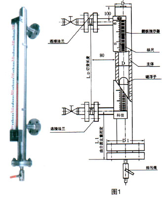 UZ-AF型側(cè)裝型磁性翻板液位計(jì)(圖1所示)是以浮子內(nèi)磁鋼驅(qū)動(dòng)雙色薄片的翻轉(zhuǎn)來指示液位的一種新型儀表.主體內(nèi)磁浮子隨液位的升降而上下運(yùn)動(dòng),同時(shí)驅(qū)使主體外指示器內(nèi)的雙色薄片翻轉(zhuǎn),有液位時(shí)轉(zhuǎn)示紅色、無液位時(shí)轉(zhuǎn)示黑色。紅色和黑色色帶間的界線即代表液位高度。在指示器左側(cè)配有醒目的刻度標(biāo)尺,從而使液位的指示顯得更加清晰。